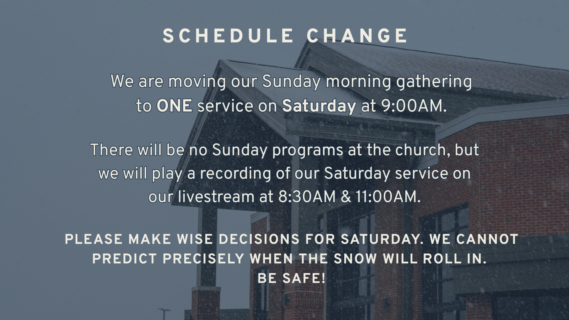 Please make wise travel decisions for your family for the Saturday service. We cannot predict precisely when the snow will roll in. We look forward to worshiping with you all.