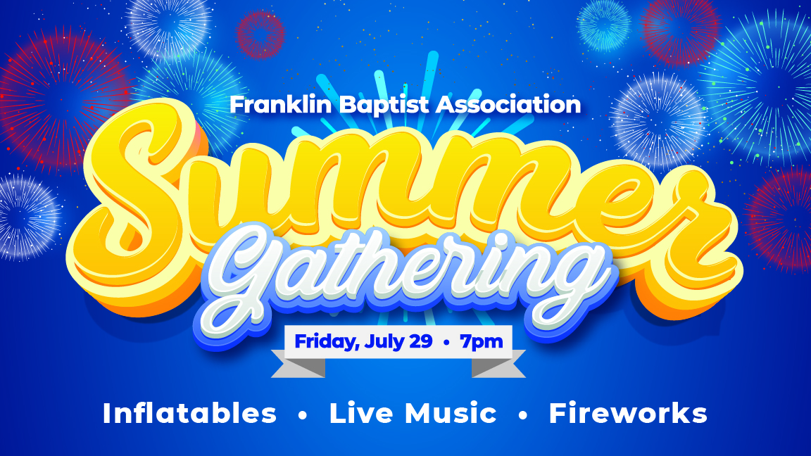 We are hosting the Franklin Baptist Association's Summer Gathering on July 29th at the Pavilion. This event will include activities for kids, live music from various Buck Run members, and the night will conclude with a fireworks show!